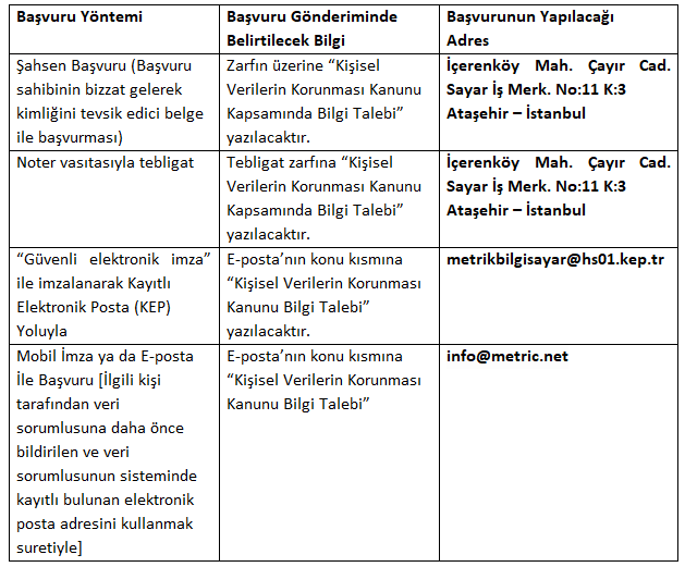 Metrik, Başvuru Sahibi tarafından e-mail yolu ile yapılacak başvurularda Başvuru Sahibinin kimliğini doğrulamak için ek bilgiler talep edebilecek, gerekli önlemleri alabilecektir.